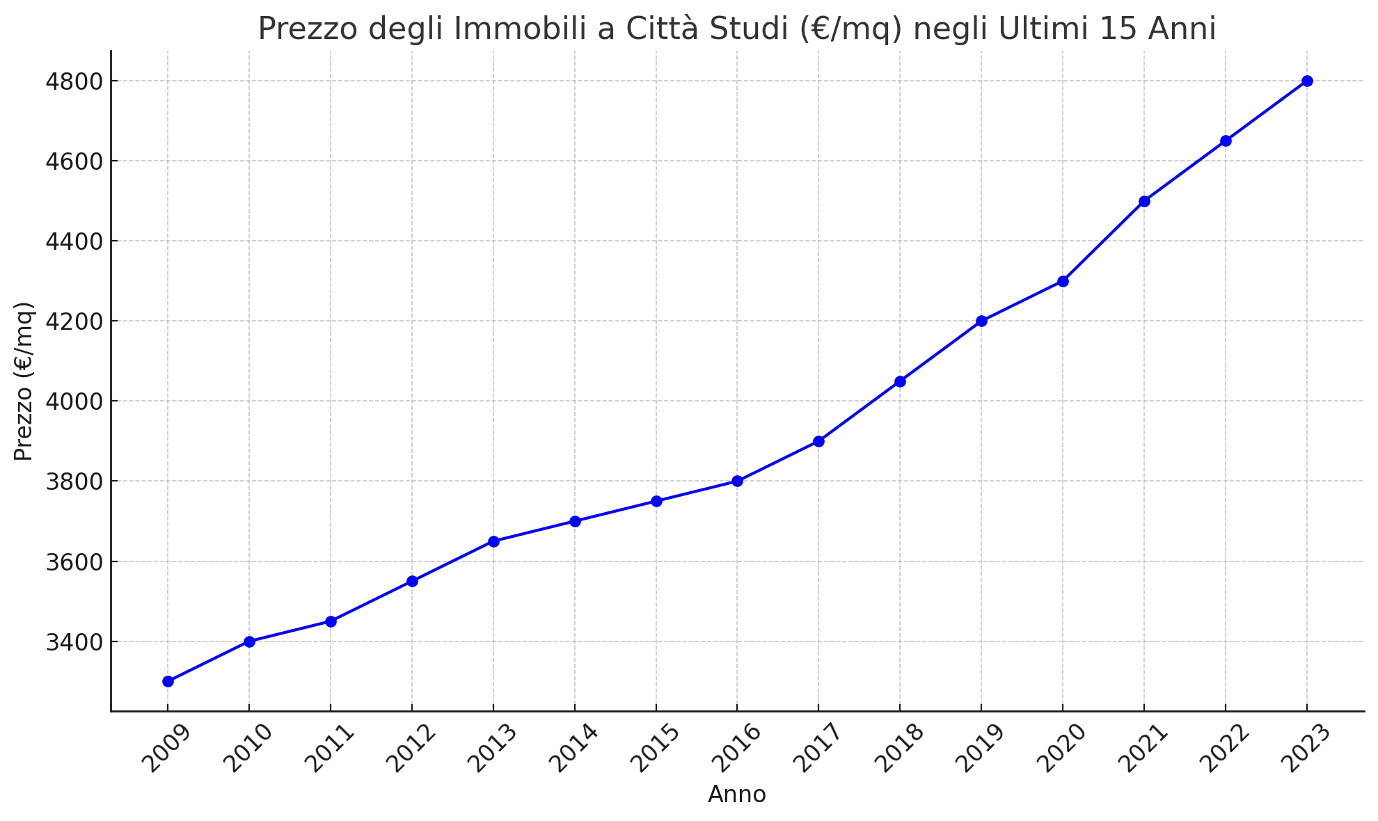 *Il grafico che mostra l’andamento del prezzo degli immobili a Città Studi negli ultimi 15 anni, espresso in euro per metro quadrato (€/mq).